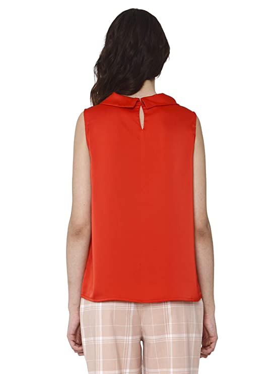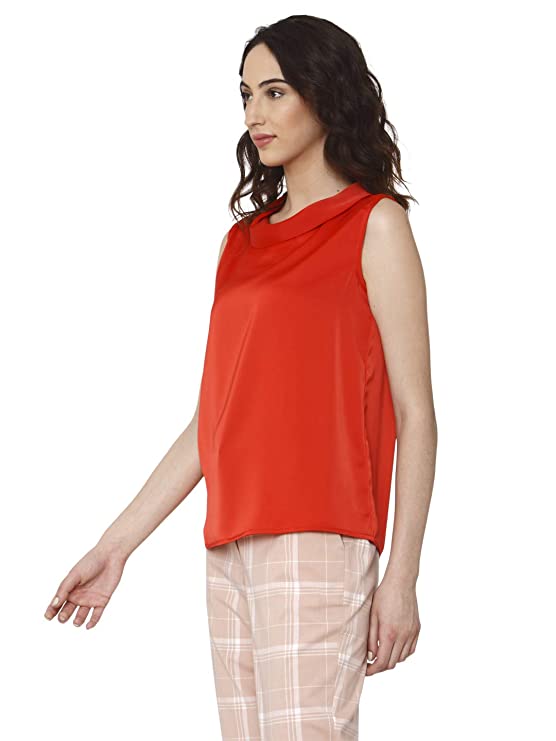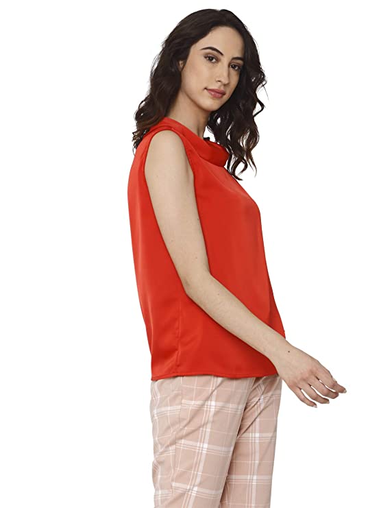 Women Red Solid Cowl Neck Sleeveless Slim Fit Cropped / Short Casual Wear Top